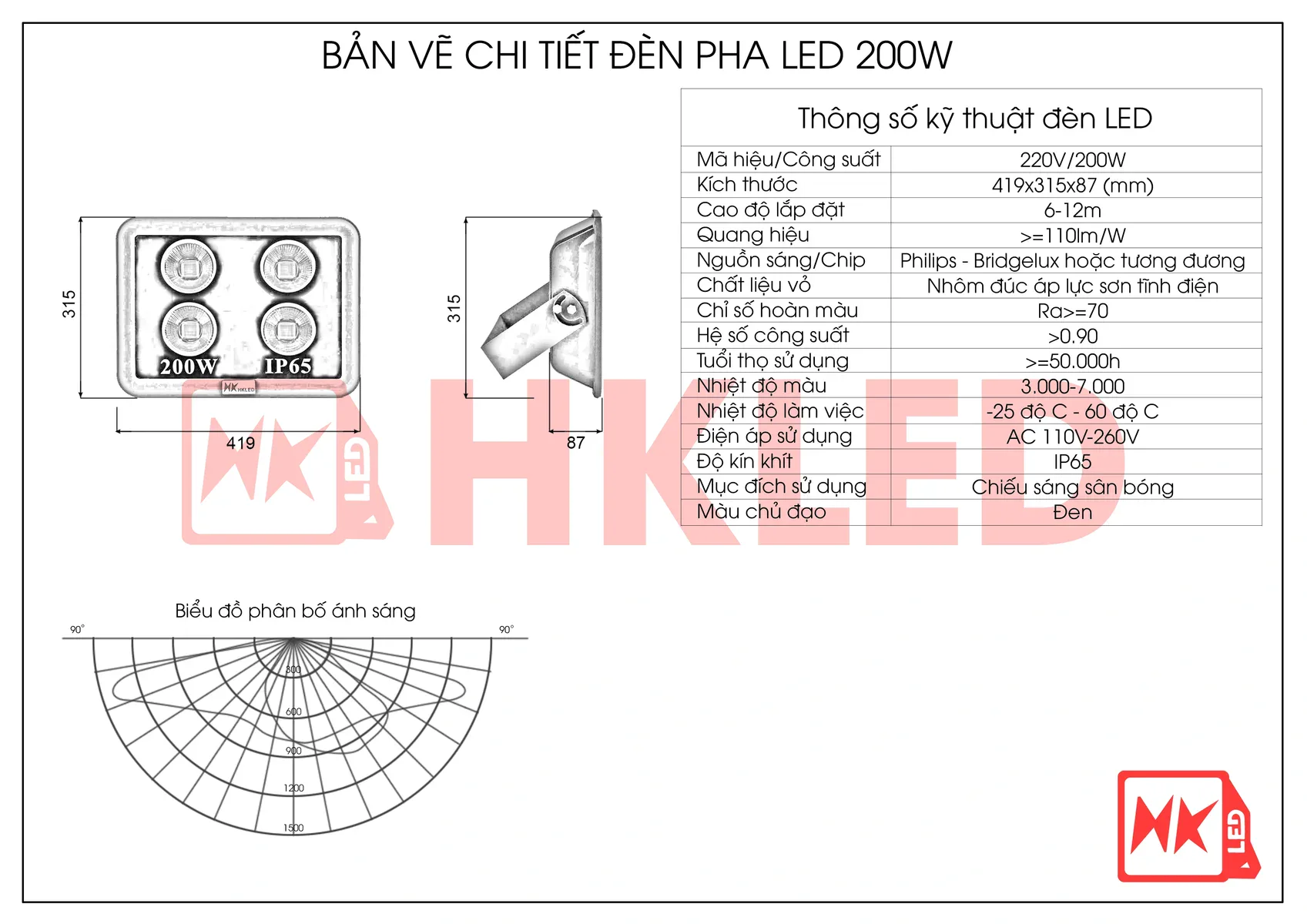 ✅Thông số kỹ thuật của đèn pha sân bóng đá 200W
