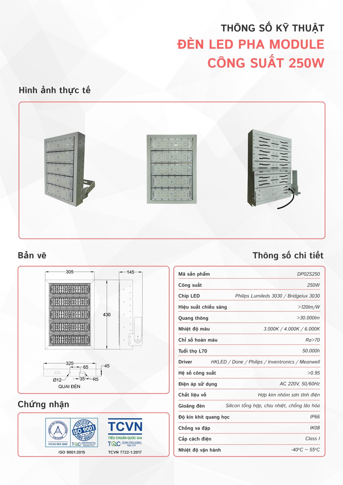 Đèn pha sân bóng đá 250W được lắp ráp từ những linh kiện nhập khẩu từ các thương hiệu hàng đầu thế giới như: Philips, Bridgelux, Done, Cree, Meanwell