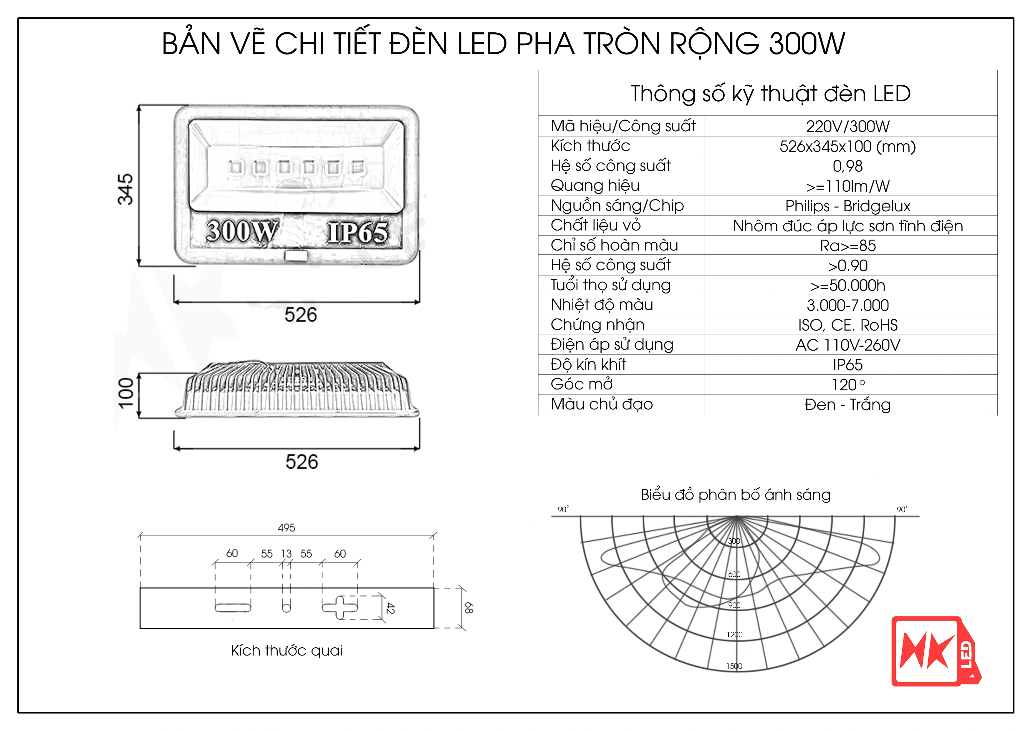 2. Thông số kỹ thuật chung của đèn pha sân bóng 300W