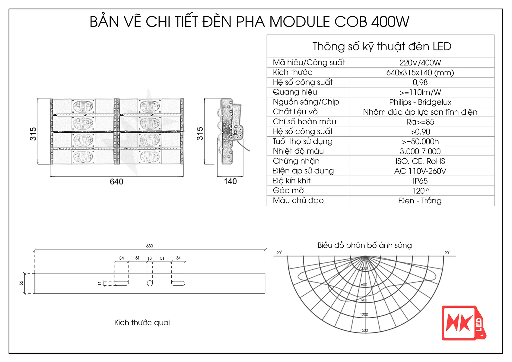 + Chipled: Philips, Bridgelux, quang thông 130 lm/w, nhiệt độ màu từ 3.000K– 6.000K
