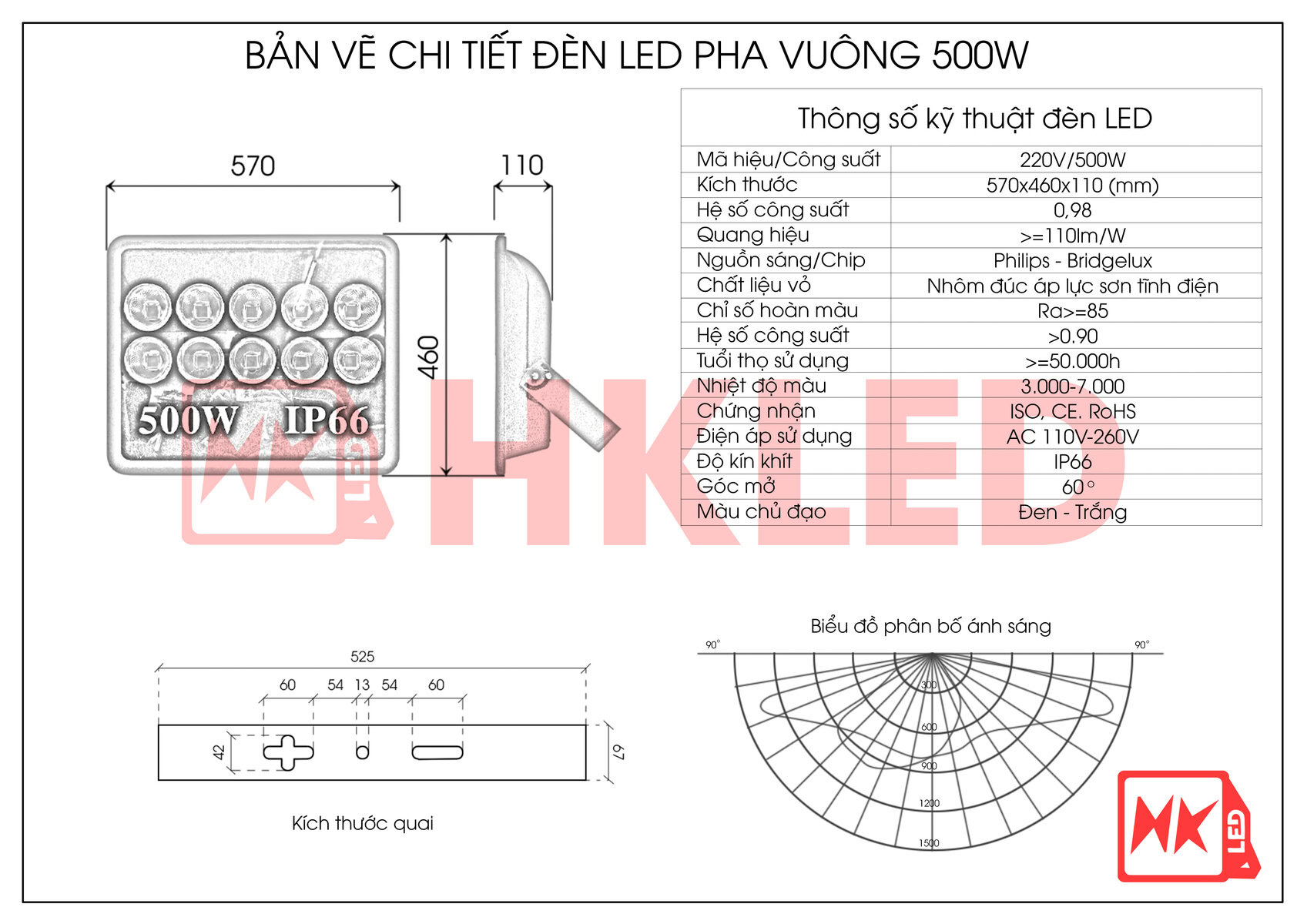 Ví dụ mẫu 500W LED flood light cho sân thể thao: hiệu suất tới ~130 lm/W, tuổi thọ ~80.000 giờ, IP66 (chống nước/bụi tốt)